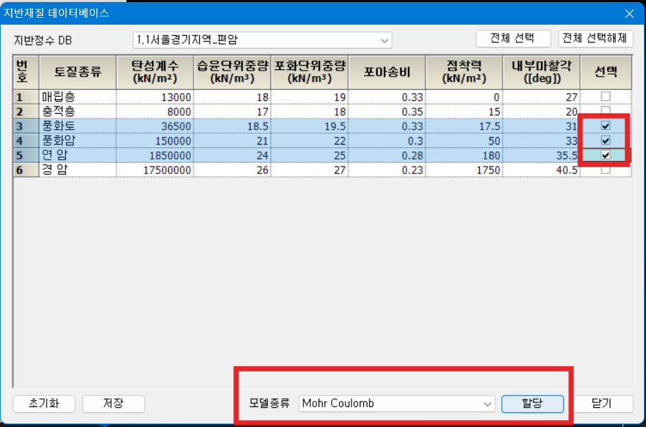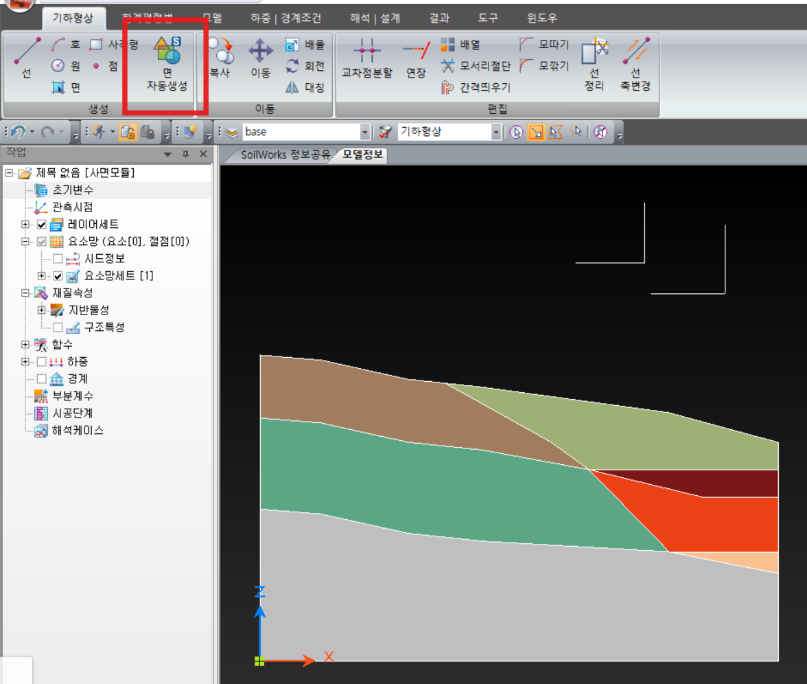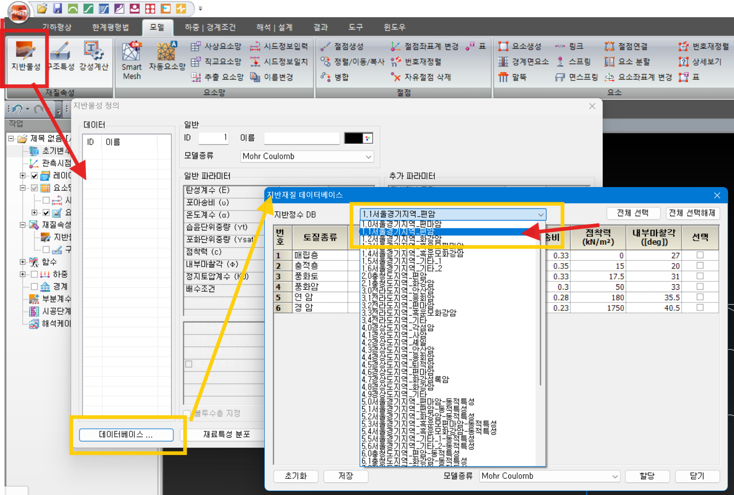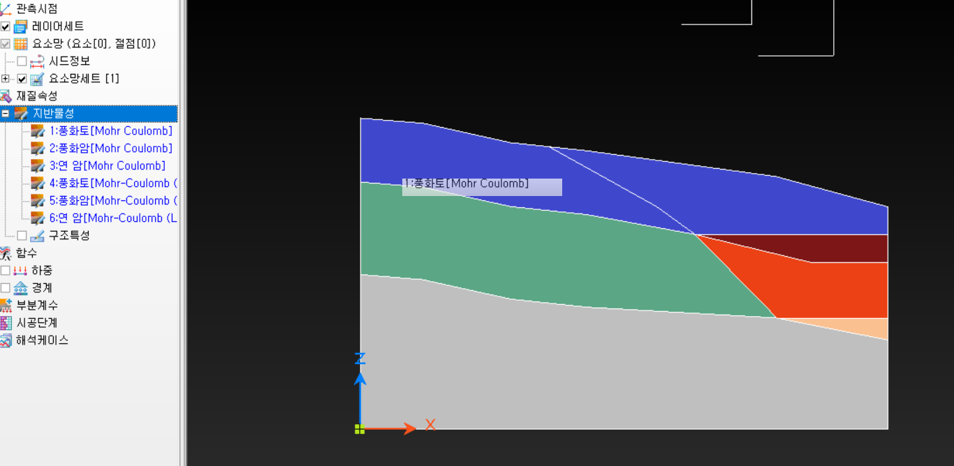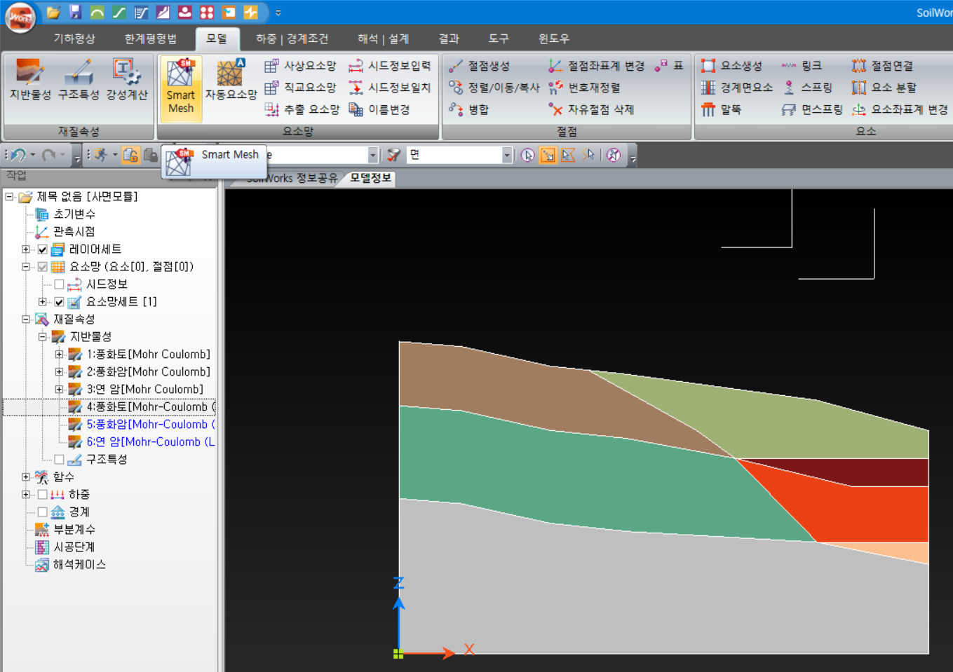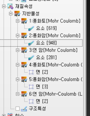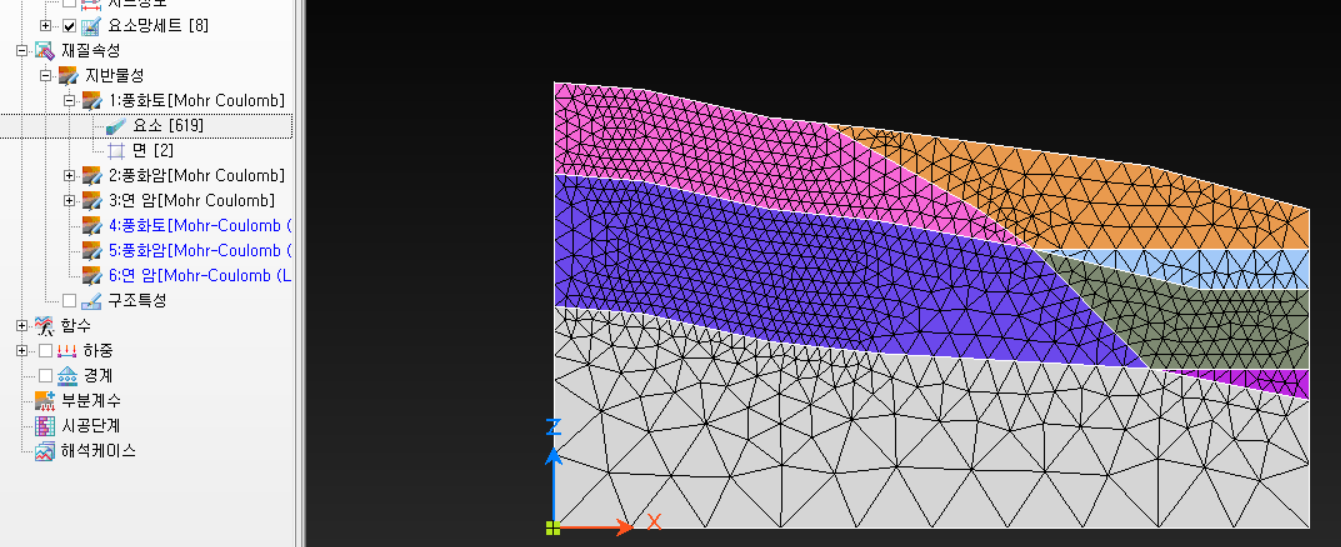 먼저 Mohr-Coulomb 모델을 지정해주고, 그 상태에서 요소망을 생성한다.